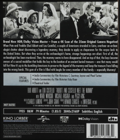 Widescreen. When Pete and Freddie (Bud Abbott and Lou Costello), a couple of Americans stranded in Cairo, overhear an archaeologist chatter about discovering a legendary mummy, they decide to apply as chaperones for the corpse back to the U.S. Of course, strange shenanigans are afoot in this comedy gem. In B&W. 79 minutes. UHD Blu-ray.