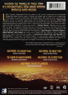 Discover the twinkle of tinsel town in five documentaries. Hosted by such greats as Gene Kelly, Henry Fonda, and Burt Reynolds. Includes Hollywood: The Golden Years, Hollywood: The Great Stars, The Legend of Marilyn Monroe, Hollywood: The Selznick Years, and Hollywood: The Gift of Laughter. In Color and B&W. Over 5 hours on two DVDs.