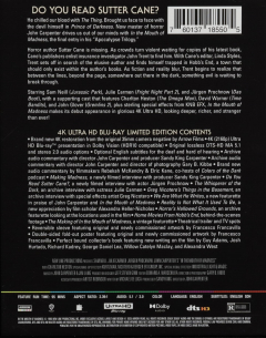 Widescreen. An insurance investigator begins discovering that the impact a horror writer's books have on his fans is more than inspirational. Stars Sam Neill and Julie Carmen. Includes a perfect-bound collector's book and a double-sided fold-out poster. Rated R. English SDH. 95 minutes. Slipcased.
