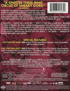 Widescreen. A spaceship, looking like a circus tent, lands in a field near a small town, signaling the attack of deviant, red-nosed, balloon-twisting psychos from another world who plan to annihilate mankind by turning people into cotton candy! English SDH. Includes UHD Blu-ray and Blu-ray versions. Packaged in a steelbook case. 86 minutes.