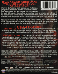 Widescreen. When a dysfunctional family clashes over the holidays, young Max is disillusioned and turns his back on Christmas. Little does he know, this lack of festive spirit has unleashed the wrath of Krampus. Stars Toni Collette and Alison Tolman. Unrated. English SDH. Includes UHD Blu-ray and Blu-ray versions. Packaged in a steelbook case. 102 minutes.