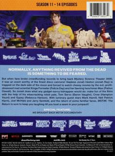 Hapless Jonah Heston (Jonah Ray) is trapped on the dark side of the moon and forced to watch cheesy movies by the evil, profit-obsessed mad scientist Kinga Forrester (Felicia Day) and her fawning henchman Max. Guest stars include Mark Hamill, Neil Patrick Harris, and Jerry Seinfeld. Collects all 14 episodes of Season Eleven. Twenty-one hours on 8 DVDs.