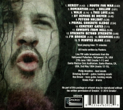 Collects portions of two performances by Pantera recorded from live FM broadcasts from June 27th, 1992, and May 2nd, 1994. Collects 15 tracks including Heresy; Mouth for War; Domination; By Demons be Driven; Psycho Holiday; Strength Beyond Strength; and more.