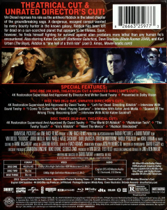 Widescreen. Vin Diesel reprises his role as the antihero Riddick in the latest chapter of the explosive sci-fi saga. Packaged in a steelbook case. Includes UHD Blu-ray and two Blu-ray versions of the Theatrical cut and the Unrated Director's cut. Rated R. English SDH. 119 minutes.