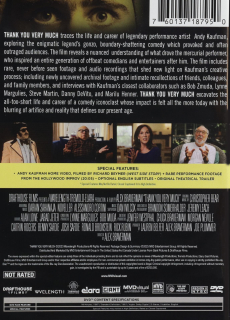 Widescreen. Traces the life and career of legendary performance artist Andy Kaufman, exploring the enigmatic legend's gonzo, boundary-shattering comedy, which provoked and often outraged audiences. Includes rare, never-before-seen footage and audio recordings, newly uncovered archival footage, and intimate recollections from friends, colleagues, and family members. Not Rated. 99 minutes.