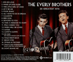 Twenty memorable Everly Brothers classics on one disc! Includes Bye Bye Love; Wake Up Little Suzie; This Little Girl of Mine; Let It Be Me; Poor Jenny; Devoted to You; Crying in the Rain; Don't Blame Me; Bird Dog; Cathy's Clown; Lucille; So Sad (to Watch Good Love Go Bad); and more.