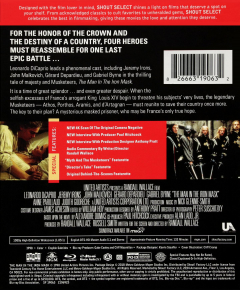 Widescreen. When the selfish excesses of France's arrogant King Louis XIV begin to threaten his subjects' very lives, the legendary Musketeers--Athos, Porthos, Aramis, and d'Artagnon--must reunite to save their country once more. Stars Leonardo DiCaprio and John Malkovich. English SDH. 132 minutes.